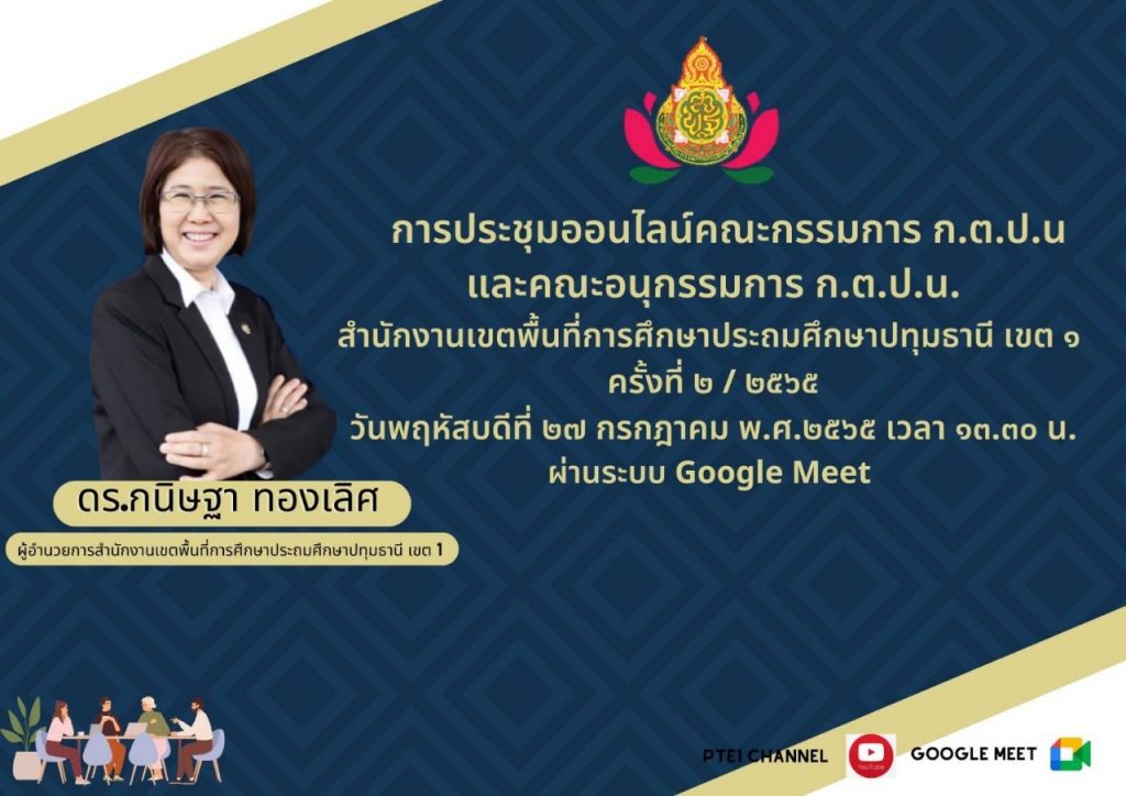 (27 กรกฎาคม พ.ศ.2565) เวลา 13.00 น. ดร.กนิษฐา ทองเลิศ ผู้อำนวยการสำนักงานเขตพื้นที่การศึกษา ประถมศึกษาปทุมธานี เขต 1 เป็นประธานการประชุมและเข้าร่วมการประชุม การดำเนินงานขับเคลื่อนพัฒนาคุณภาพการศึกษาของคณะกรรมการติดตาม ตรวจสอบ การประะเมินผล และนิเทศการศึกษา (ก.ต.ป.น.) ครั้งที่ 2/2565