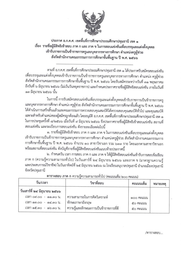 ประกาศ อ.ก.ค.ศ. เขตพื้นที่การศึกษาประถมศึกษาประถมศึกษาปทุมธานี เขต 1