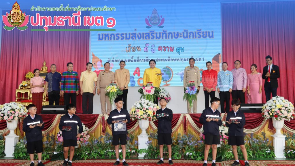 วันจันทร์ที่ ๑๘ ธันวาคม ๒๕๖๖ เวลา ๐๘.๓๐ น. สำนักงานเขตพื้นที่การศึกษาประถมศึกษาปทุมธานี เขต 1 นำโดย ดร.กัมพล เจริญรักษ์ ผู้อำนวยการสำนักงานเขตพื้นที่การศึกษาประถมศึกษาปทุมธานี เขต ๑ จัดพิธีเปิดการแข่งขันมหกรรมส่งเสริมทักษะนักเรียน เรียนดี มีความสุข ณ โรงเรียนประถมศึกษาธรรมศาสตร์ อำเภอคลองหลวง จังหวัดปทุมธานี โดยมีนายสุรศักดิ์ พันธ์เจริญวรกุล รัฐมนตรีช่วยว่าการกระทรวงศึกษาธิการ เป็นประธานในพิธี พร้อมด้วย นายพิษณุ พลธี ผู้ช่วยเลขานุการรัฐมนตรีว่าการกระทรวงศึกษาธิการ พล.ต.ท. คำรณวิทย์ ธูปกระจ่าง นายกองค์การบริหารส่วนจังหวัดปทุมธานี ผู้บริหารสถานศึกษา คณะครูและ นักเรียน เข้าร่วมงาน