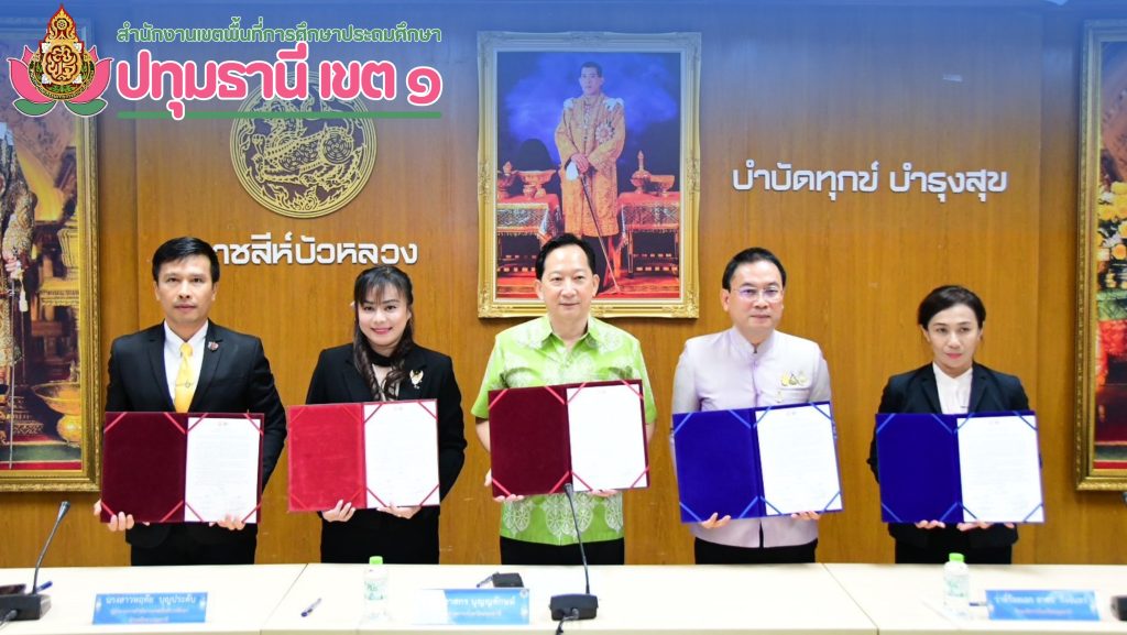 วันที่ 7 กุมภาพันธ์ 2567 นางสาวสายใจ พุ่มถาวร รองผู้อำนวยการสำนักงานเขตพื้นที่การศึกษาประถมศึกษาปทุมธานี เขต 1 ร่วมลงนามข้อตกลงความร่วมมือ (MOU) เป็นภาคีเครือข่ายในการดำเนินงานโครงการสถานศึกษาสีขาว ปลอดยาเสพติดและอบายมุข ระหว่าง จังหวัดปทุมธานี กับ สำนักงานศึกษาธิการจังหวัดปทุมธานี โดยมีนายภาสกร บุญญลักษม์ ผู้ว่าราชการจังหวัดปทุมธานี เป็นประธานในการลงนาม และได้มี สพม.ปทุมธานี สพป.ปทุมธานี เขต 1 และสพป.ปทุมธานี เขต 2 ณ ห้องประชุมราชสีห์บัวหลวง ชั้น 3 ศาลากลางจังหวัดปทุมธานี