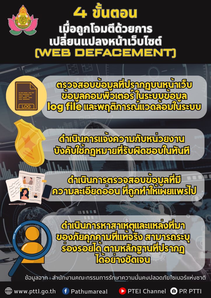 ด้วยสำนักงานคณะกรรมการการศึกษาขั้นพื้นฐาน ได้รับแจ้งจากสำนักงานคณะกรรมการ การรักษาความมั่นคงปลอดภัยไซเบอร์แห่งชาติว่า ได้ตรวจพบการถูกโจมตีด้วยการเปลี่ยนแปลงหน้าเว็บไซต์(Website Defacement) ของโรงเรียนในสังกัด ในการนี้สำนักงานคณะกรรมการการรักษาความมั่นคงปลอดภัยไซเบอร์แห่งชาติ ได้จัดทำคำแนะนำเบื้องต้นเพื่อให้หน่วยงานที่ได้รับผล กระทบจากการถูกโจมตีด้วยการเปลี่ยนแปลงหน้าเว็บไซต์(Website Defacement) ดำเนินการ ดังนี้