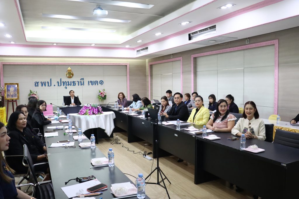 วันพฤหัสบดีที่ 22 พฤษภาคม 2568 เวลา 08.00 น. นายคำโพธิ์ บุญสิงห์ ผู้อำนวยการสำนักงานเขตพื้นที่การศึกษาประถมศึกษาปทุมธานี เขต 1 พร้อมด้วย นางสาวสายใจ พุ่มถาวร และนายธนกฤต แก้วนามไชย รองผู้อำนวยการสำนักงานเขตพื้นที่การศึกษาประถมศึกษาปทุมธานี เขต 1 นำบุคลากรร่วมรับชมรายการพฤหัสเช้า ข่าว สพฐ. ครั้งที่ 21/2568 ผ่านระบบออนไลน์ และร่วมประชุมคณะกรรมการบริหารสำนักงานเขตพื้นที่การศึกษาฯ เพื่อมอบนโยบายการบริหารงาน แจ้งข้อราชการ ติดตามและประสานภารกิจในการบริหารจัดการศึกษา ตามนโยบายของสำนักงานคณะกรรมการการศึกษาขั้นพื้นฐาน และนโยบายของสำนักงานเขตพื้นที่การศึกษา ณ ห้องประชุมบัวชมพู สำนักงานเขตพื้นที่การศึกษาประถมศึกษาปทุมธานี เขต 1