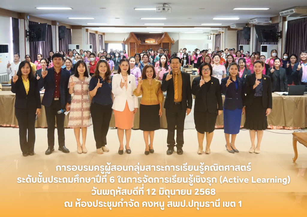 วันพฤหัสบดีที่ 12 มิถุนายน 2568 เวลา 09.00 น. นายคำโพธิ์ บุญสิงห์ ผู้อำนวยการสำนักงานเขตพื้นที่การศึกษาประถมศึกษาปทุมธานี เขต 1 มอบหมายให้ นางสาวสายใจ พุ่มถาวร รองผู้อำนวยการสำนักงานเขตพื้นที่การศึกษาประถมศึกษาปทุมธานี เขต 1 เป็นประธานเปิดการอบรมครูผู้สอนกลุ่มสาระการเรียนรู้คณิตศาสตร์ ระดับชั้นประถมศึกษาปีที่ 6 ในการจัดการเรียนรู้เชิงรุก (Active Learning) ตามโครงการพัฒนาการจัดการเรียนรู้เพื่อเสริมสร้างสมรรถนะผู้เรียนในศตวรรษที่ 21 บนวิถีใหม่ ประจำปีงบประมาณ พ.ศ. 2568 เพื่อพัฒนาครูผู้สอนให้สามารถจัดการเรียนรู้แบบเชิงรุก (Active Learning) และส่งเสริมผู้เรียนให้มีคุณลักษณะและทักษะในศตวรรษที่ 21 ซึ่งมีนางสาวณภัทร ใจกล้า ศึกษานิเทศก์ชำนาญการพิเศษ สำนักงานเขตพื้นที่การศึกษามัธยมศึกษาปทุมธานี เป็นวิทยากร โดยมีครูผู้สอนวิชาคณิตศาสตร์ ระดับชั้นประถมศึกษาปีที่ 6 โรงเรียนในสังกัด จำนวน 102 คน เข้าร่วมอบรม ณ ห้องประชุมกำจัด คงหนู สำนักงานเขตพื้นที่การศึกษาประถมศึกษาปทุมธานี เขต 1