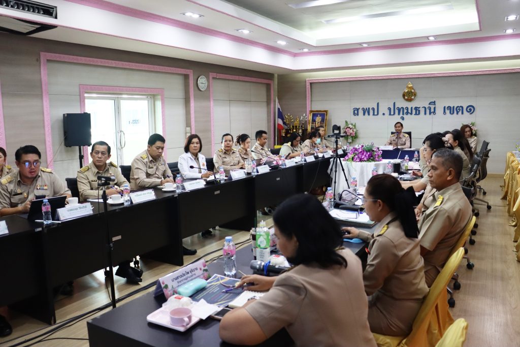 วันจันทร์ที่ 16 มิถุนายน 2568 เวลา 09.00 น. นายคำโพธิ์ บุญสิงห์ ผู้อำนวยการสำนักงานเขตพื้นที่การศึกษาประถมศึกษาปทุมธานี เขต 1 เป็นประธานการประชุมผู้บริหารสถานศึกษา และบุคลากรทางการศึกษา สำนักงานเขตพื้นที่การศึกษาประถมศึกษาปทุมธานี เขต 1 ครั้งที่ 6/2568 เพื่อแจ้งข้อราชการ โดยมีรองผู้อำนวยการสำนักงานเขตพื้นที่การศึกษา ประธานเครือข่าย ผู้อำนวยการกลุ่ม/หน่วย คณะศึกษานิเทศก์ และเจ้าหน้าที่ที่เกี่ยวข้อง เข้าร่วมประชุม ณ ห้องประชุมบัวชมพู ชั้น 3 สำนักงานเขตพื้นที่การศึกษาประถมศึกษาปทุมธานี เขต 1 และผู้อำนวยการสถานศึกษาในสังกัดเข้าร่วมประชุม ผ่านระบบออนไลน์ Zoom Meeting