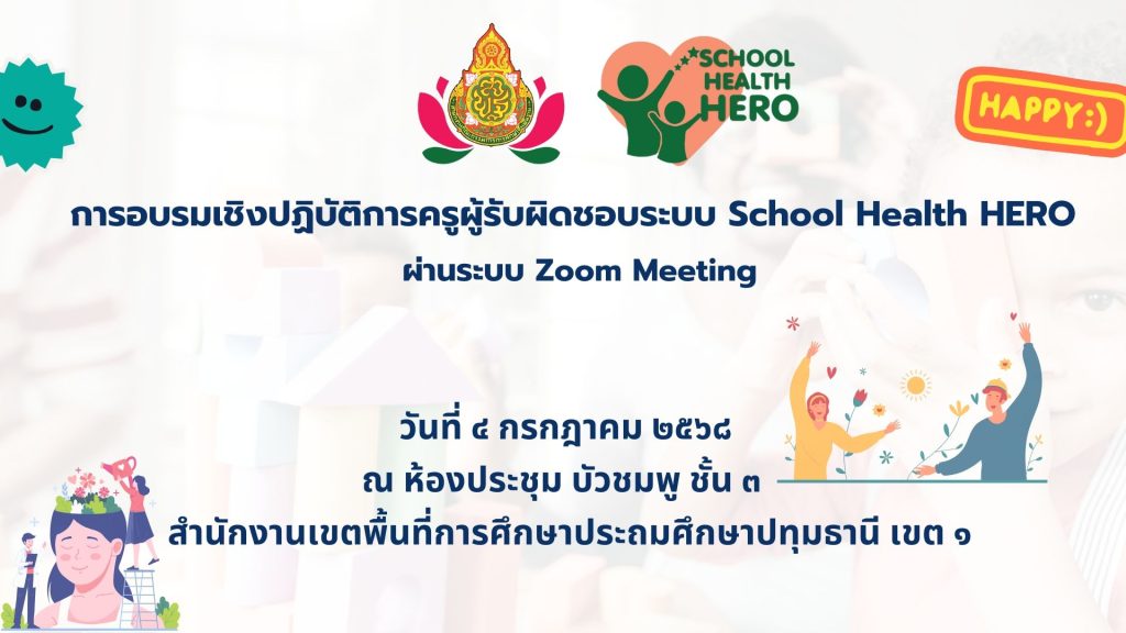 วันศุกร์ที่ 4 กรกฎาคม 2568 เวลา 09.00 น. นายคำโพธิ์ บุญสิงห์ ผู้อำนวยการสำนักงานเขตพื้นที่การศึกษาประถมศึกษาปทุมธานี เขต 1 มอบหมายให้ นางช่อลดา ทองผิว ผู้อำนวยการกลุ่มส่งเสริมการจัดการศึกษา พร้อมด้วยบุคลากรกลุ่มส่งเสริมการจัดการศึกษา ดำเนินโครงการจัดอบรมเชิงปฏิบัติการครูผู้รับผิดชอบงาน School Health HERO ในรูปแบบออนไลน์ ผ่านระบบ Zoom Meeting ณ ห้องประชุมบัวชมพู สำนักงานเขตพื้นที่การศึกษาประถมศึกษาปทุมธานี เขต 1