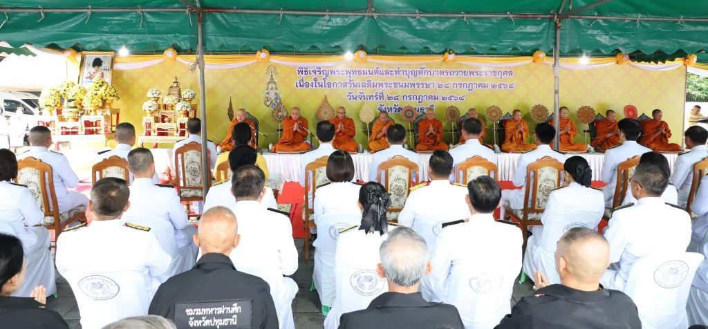 วันจันทร์ที่ 28 กรกฎาคม 2568 เวลา 06.30 น. นายคำโพธ์ บุญสิงห์ ผู้อำนวยการสำนักงานเขตพื้นที่การศึกษาประถมศึกษาปทุมธานี เขต 1 นำข้าราชการในสังกัดร่วมพิธีทำบุญตักบาตรถวายพระราชกุศล แด่พระบาทสมเด็จพระเจ้าอยู่หัว เนื่องในโอกาสวันเฉลิมพระชนมพรรษา 28 กรกฎาคม 2568 โดยมีนายสมคิด จันทมฤก ผู้ว่าราชการจังหวัดปทุมธานี เป็นประธานในพิธี นำข้าราการและประชาชน ร่วมตักบาตรข้าวสาร อาหารแห้ง พระภิกษุสงฆ์และสามเณร จำนวน 74 รูป โดยได้รับความเมตตาจากพระราชวรเมธาจารย์ เจ้าคณะจังหวัดปทุมธานี (ธรรมยุต) เจ้าอาวาสวัดโบสถ์ อำเภอสามโคก เป็นประธานฝ่ายสงฆ์ ณ บริเวณหน้าสำนักงานเหล่ากาชาดจังหวัดปทุมธานี