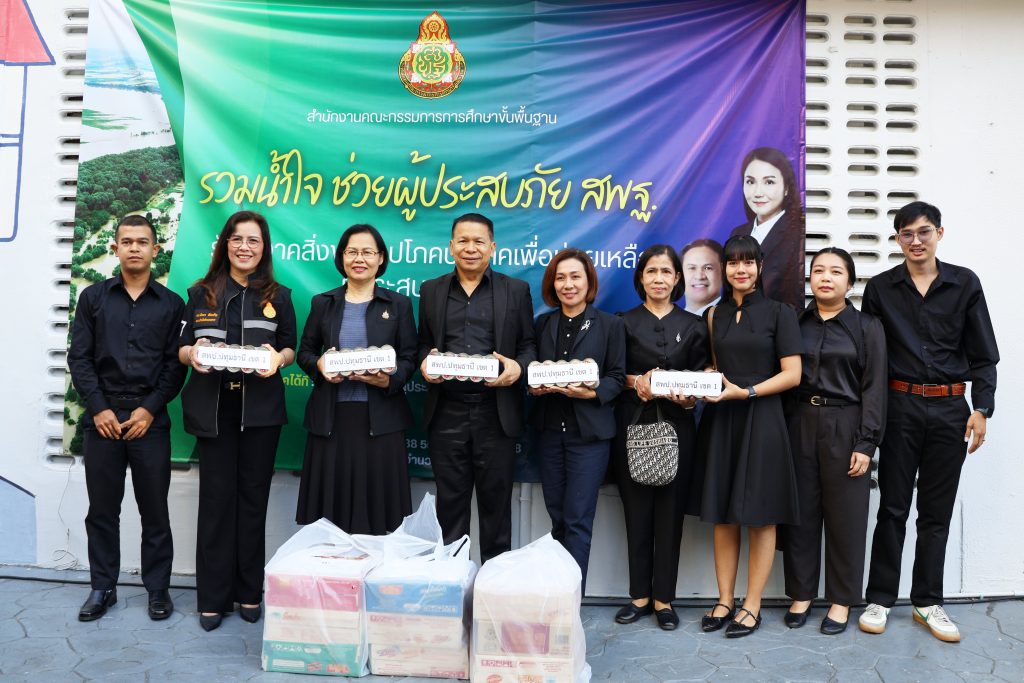 วันพฤหัสบดีที่ 4 ธันวาคม 2568 เวลา 09.00 น. นายคำโพธิ์ บุญสิงห์ ผู้อำนวยการสำนักงานเขตพื้นที่การศึกษาประถมศึกษาปทุมธานี เขต 1 มอบหมายให้ นางสาวสายใจ พุ่มถาวร รองผู้อำนวยการสำนักงานเขตพื้นที่การศึกษาประถมศึกษาปทุมธานี เขต 1 นายธนกฤต แก้วนามไชย รองผู้อำนวยการสำนักงานเขตพื้นที่การศึกษาประถมศึกษาปทุมธานี เขต 1 พร้อมด้วยบุคลากรสำนักงานเขตพื้นที่การศึกษา ร่วมพิธีปล่อยคาราวาน “สพฐ. รวมน้ำใจ ช่วยผู้ประสบภัยภาคใต้” พร้อมทั้งนำสิ่งของจำเป็นร่วมช่วยเหลือผู้ประสบอุทกภัย โดย ดร.พิเชฐ โพธิ์ภักดี เลขาธิการคณะกรรมการการศึกษาขั้นพื้นฐาน เป็นประธาน ณ สวนวันครู หน้าอาคาร สพฐ. 1 กระทรวงศึกษาธิการ