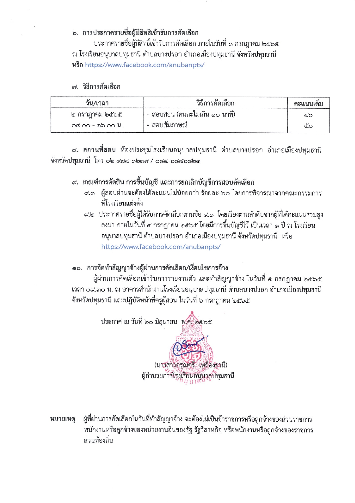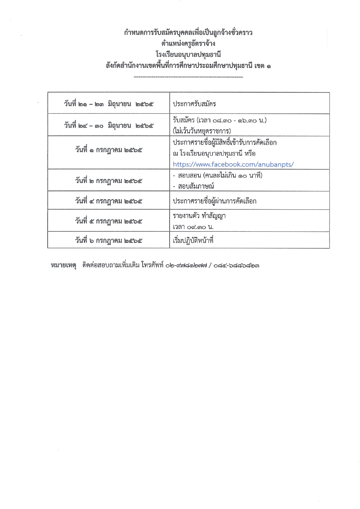 โรงเรียนอนุบาลปทุมธานี มีความประสงค์รับสมัครบุคคลเพื่อจัดจ้างเป็นลูกจ้างชั่วคราว ตำแหน่งครูอัตราจ้าง (งบประมาณจากเงินรายได้สถานศึกษาของโรงเรียน) จำนวน 2 อัตรา อัตราเงินเดือนๆละ 15,000 บาท ระหว่างวันที่ 24-30 มิถุนายน 2565 เวลา 08.30 – 16.30 น. (ไม่เว้นวันหยุดราชการ)